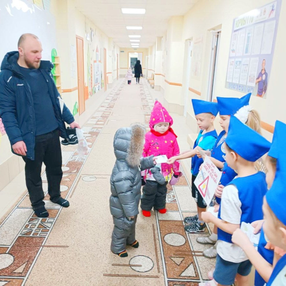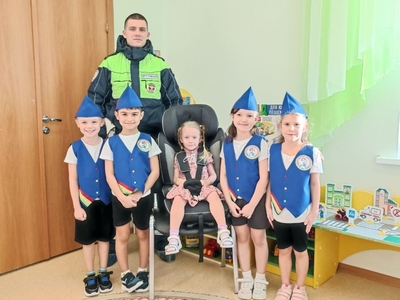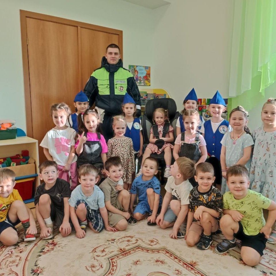 А ещё в гости к ребятам приходил инспектор ГИБДД Надежкин Николай Николаевич, который провел увлекательную беседу с детьми. Он рассказал о важности ремней безопасности и даже показал, как правильно пристегиваться в машине.